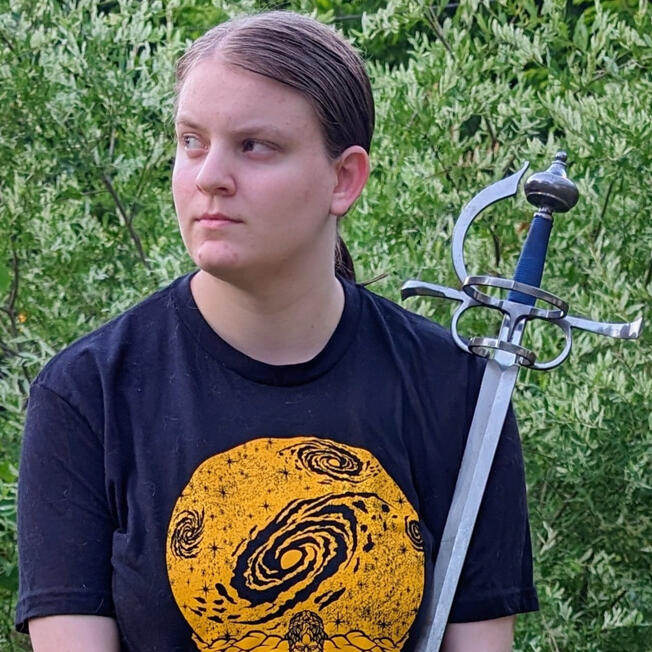 Sarah La Fetra (they/them), Assistant Coach. Sarah started studying HEMA in 2017 and has been with KAB for three years. They specialize in sword and buckler.