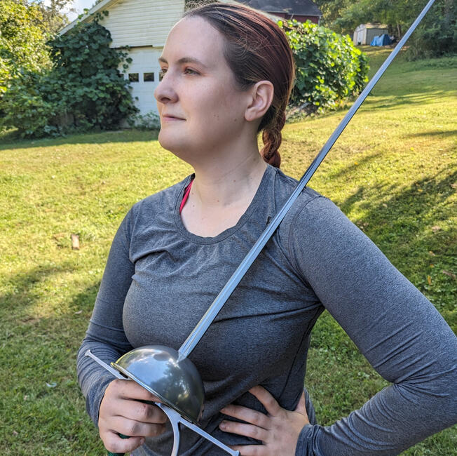 Stephanie Farmer (she/her), Assistant Head Coach. Stephanie fenced off and on before Covid, and has studied and practiced regularly since 2020.